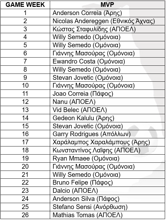 Στη λίστα των διακριθέντων, Άρης και Πάφος FC κατέγραψαν τριπλή εκπροσώπηση. Την επιτυχία της «Ελαφράς Ταξιαρχίας» υπέγραψαν οι Anderson Correia, Gedeon Kalulu και Χαράλαμπος Χαραλάμπους, ενώ για την ομάδα της Πάφου το βραβείο εξασφάλισαν οι Joao Correia, Bruno Felipe και Anderson Silva. Επιπλέον, τη δική τους σφραγίδα στην κανονική διάρκεια του πρωταθλήματος άφησαν οι Nicolas Andereggen (Εθνικός Άχνας), Garry Rodrigues (Απόλλων) και Stefano Sensi (Ανόρθωση), οι οποίοι αναδείχθηκαν από μια φορά πολυτιμότεροι.